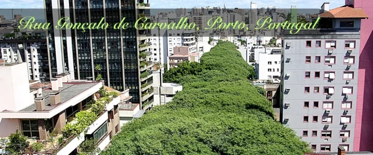 Rua Gonçalo de Carvalho feels wrapped in green light. Tall trees arch overhead. Leaves filter sun into soft patterns. Old stone buildings rest quietly behind the canopy. The street feels cool, shaded, and gently protected from the city noise.